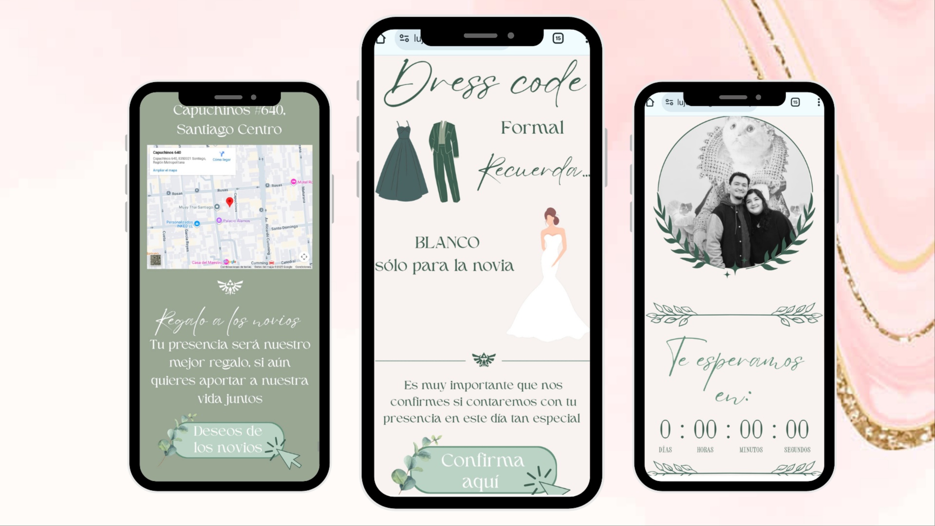 Botones interactivos que permiten a sus invitados acceder a la ubicación del evento, confirmar asistencia y ver los deseos de los novios.