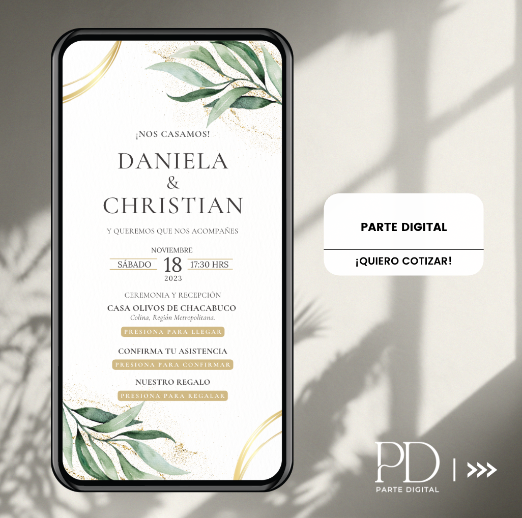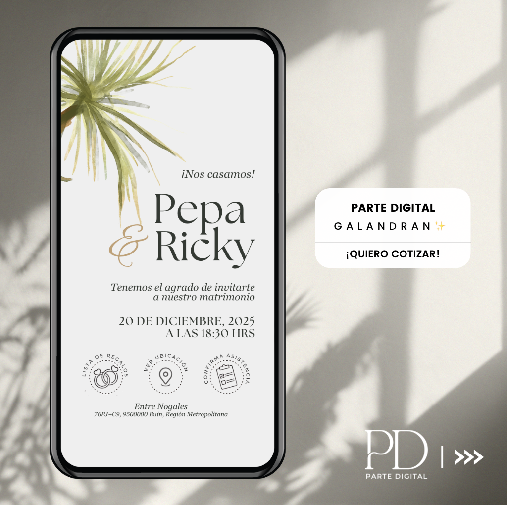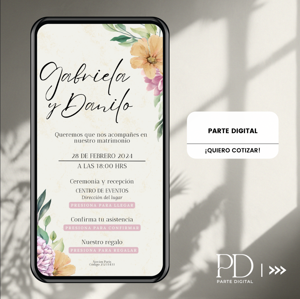 Somos especialistas en partes digitales para matrimonios, con más de 4 años de experiencia creando invitaciones, tarjetas y recuerdos digitales personalizados. Ofrecemos distintos formatos web y PDF, totalmente interactivos y fáciles de compartir, adaptándonos a cada estilo y temática de matrimonio.
