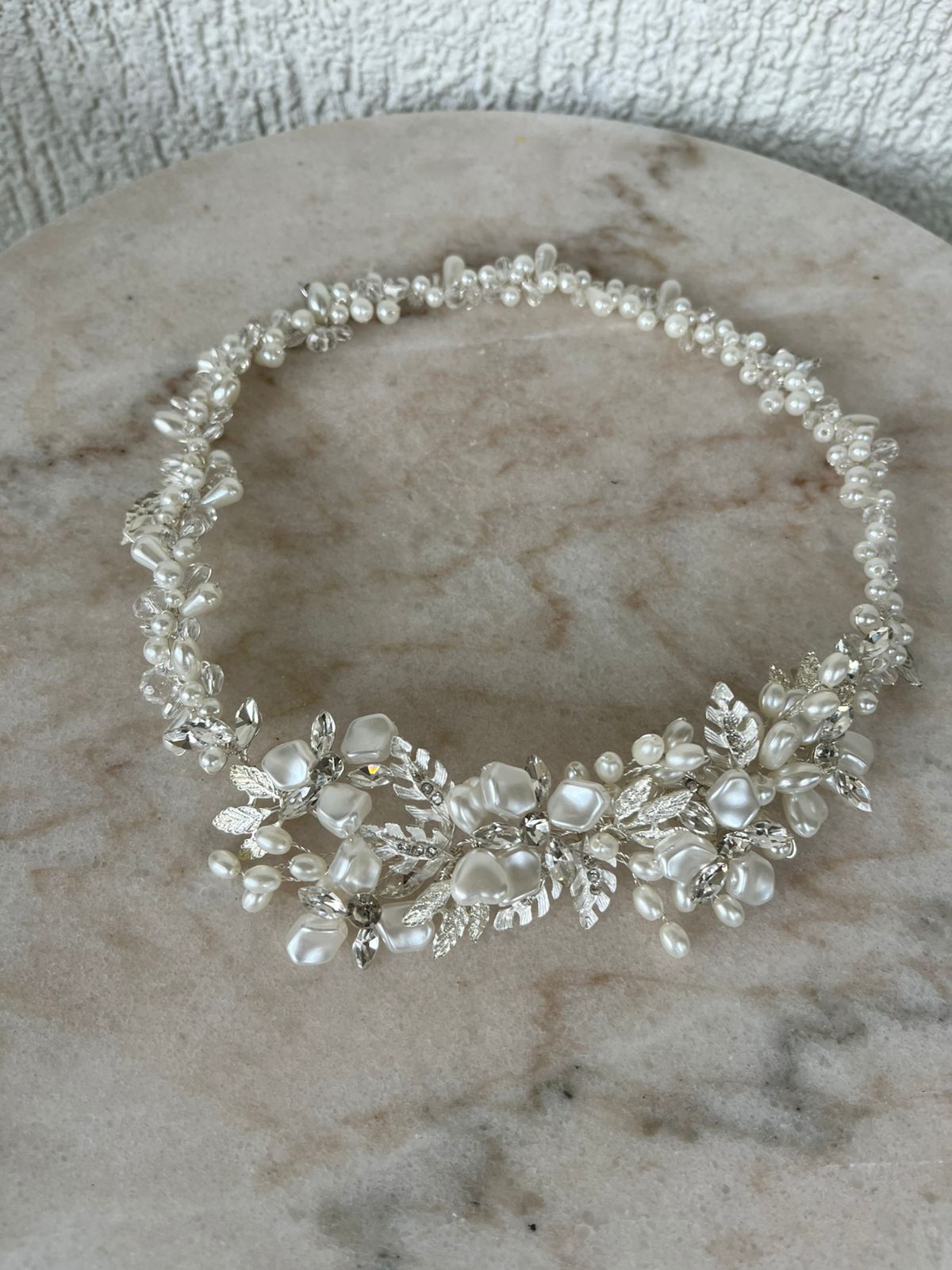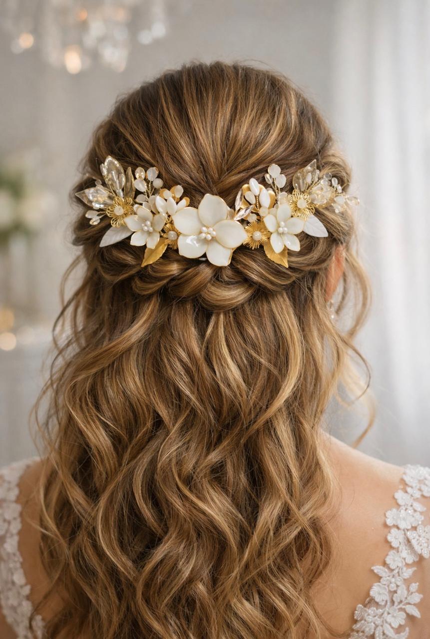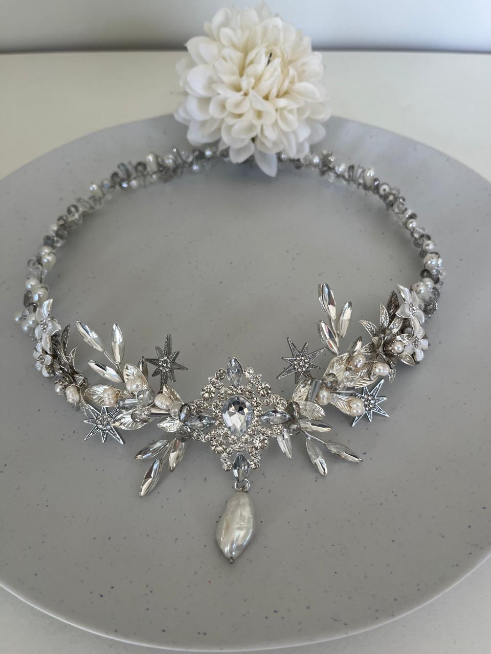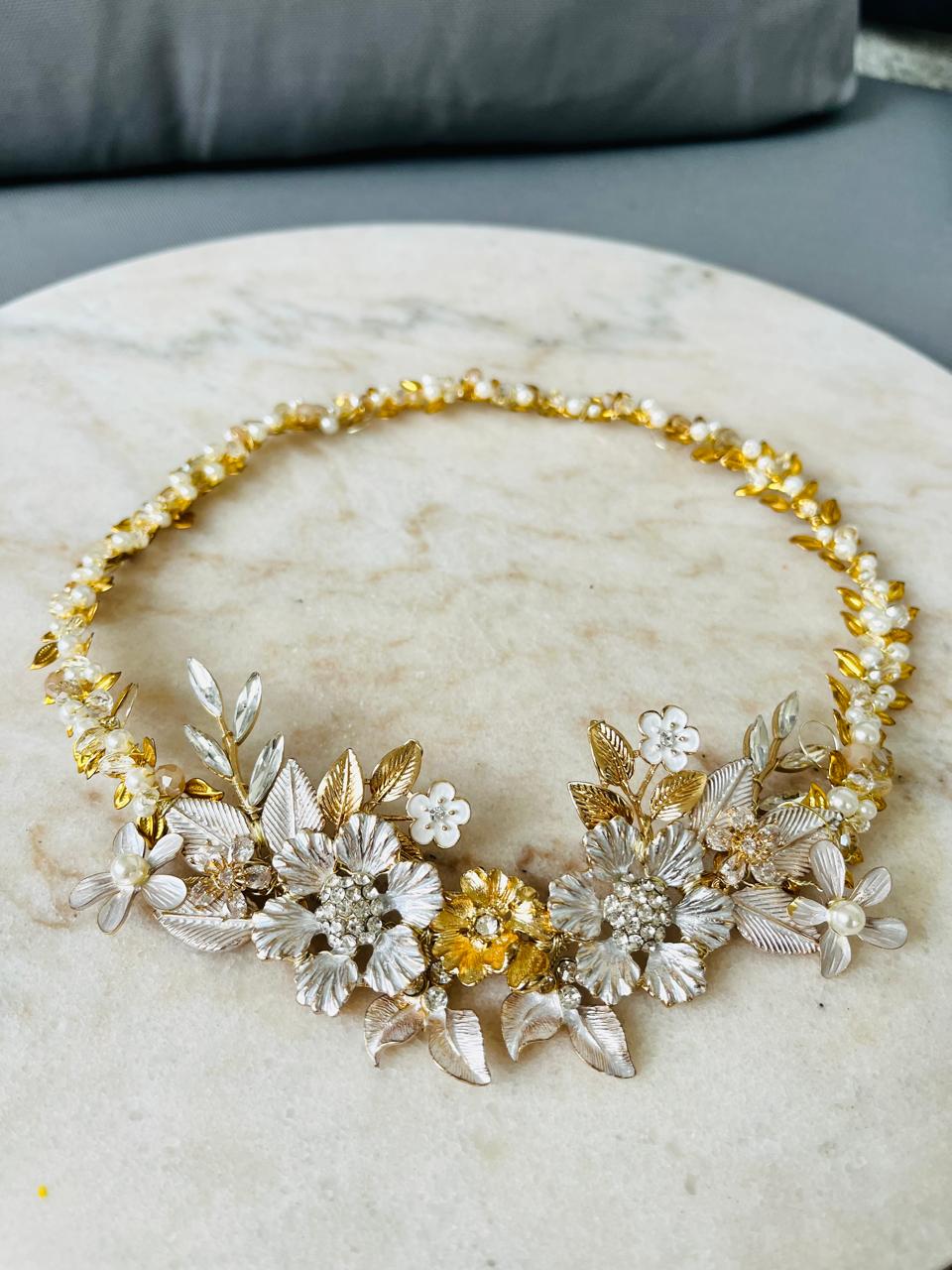 Creamos piezas únicas como coronas, tiaras y tocados personalizados, elaboradas con materiales de alta calidad como cristales, perlas y detalles metálicos en tonos delicados. Cada diseño está pensado para armonizar con tu peinado, vestido y esencia, logrando un look equilibrado, elegante y auténtico.