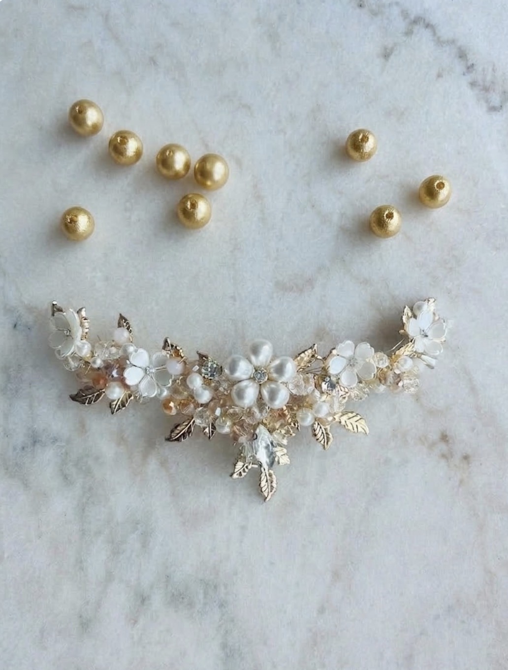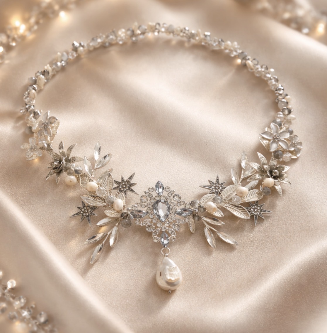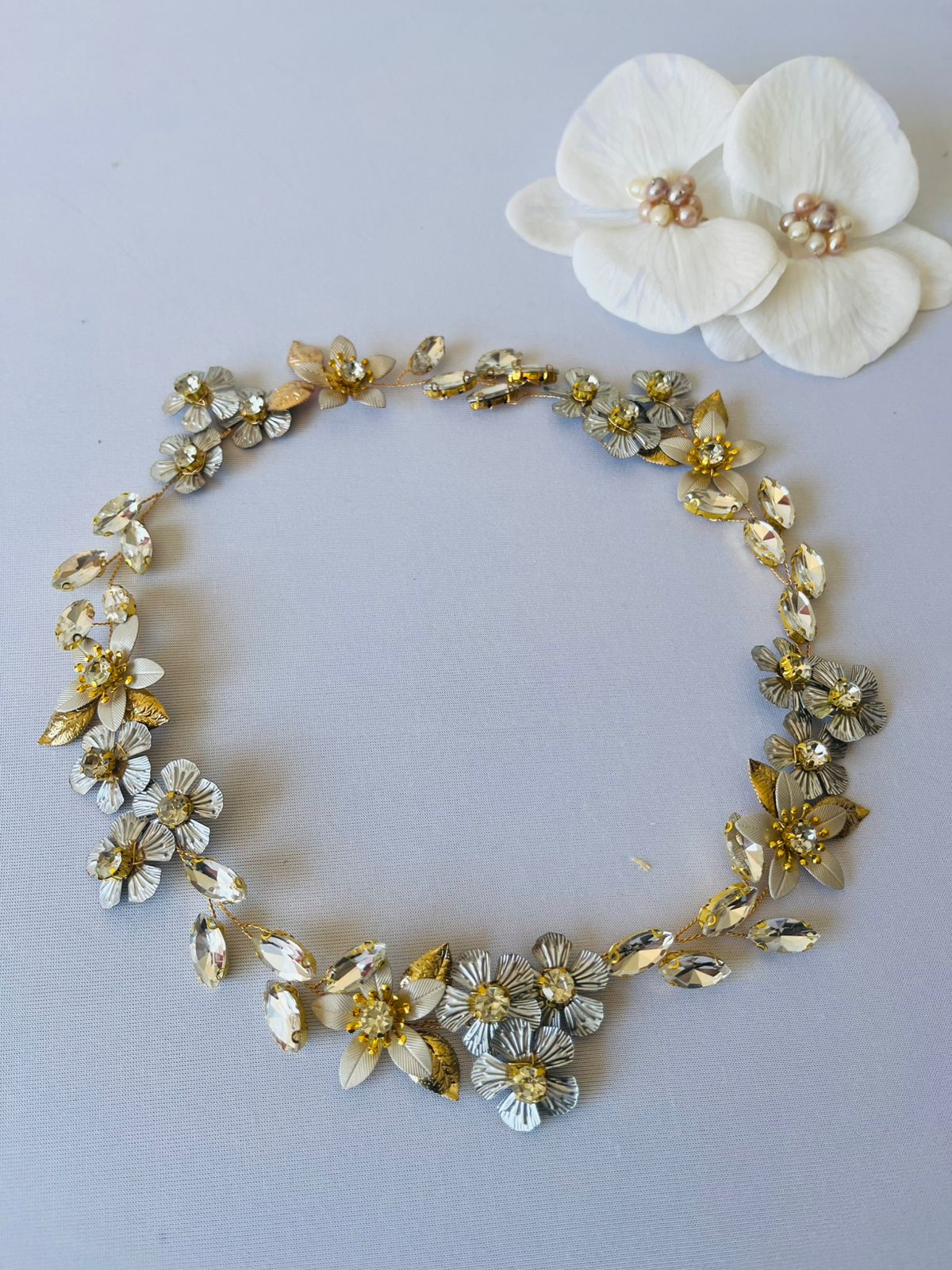 Creamos piezas únicas como coronas, tiaras y tocados personalizados, elaboradas con materiales de alta calidad como cristales, perlas y detalles metálicos en tonos delicados. Cada diseño está pensado para armonizar con tu peinado, vestido y esencia, logrando un look equilibrado, elegante y auténtico.