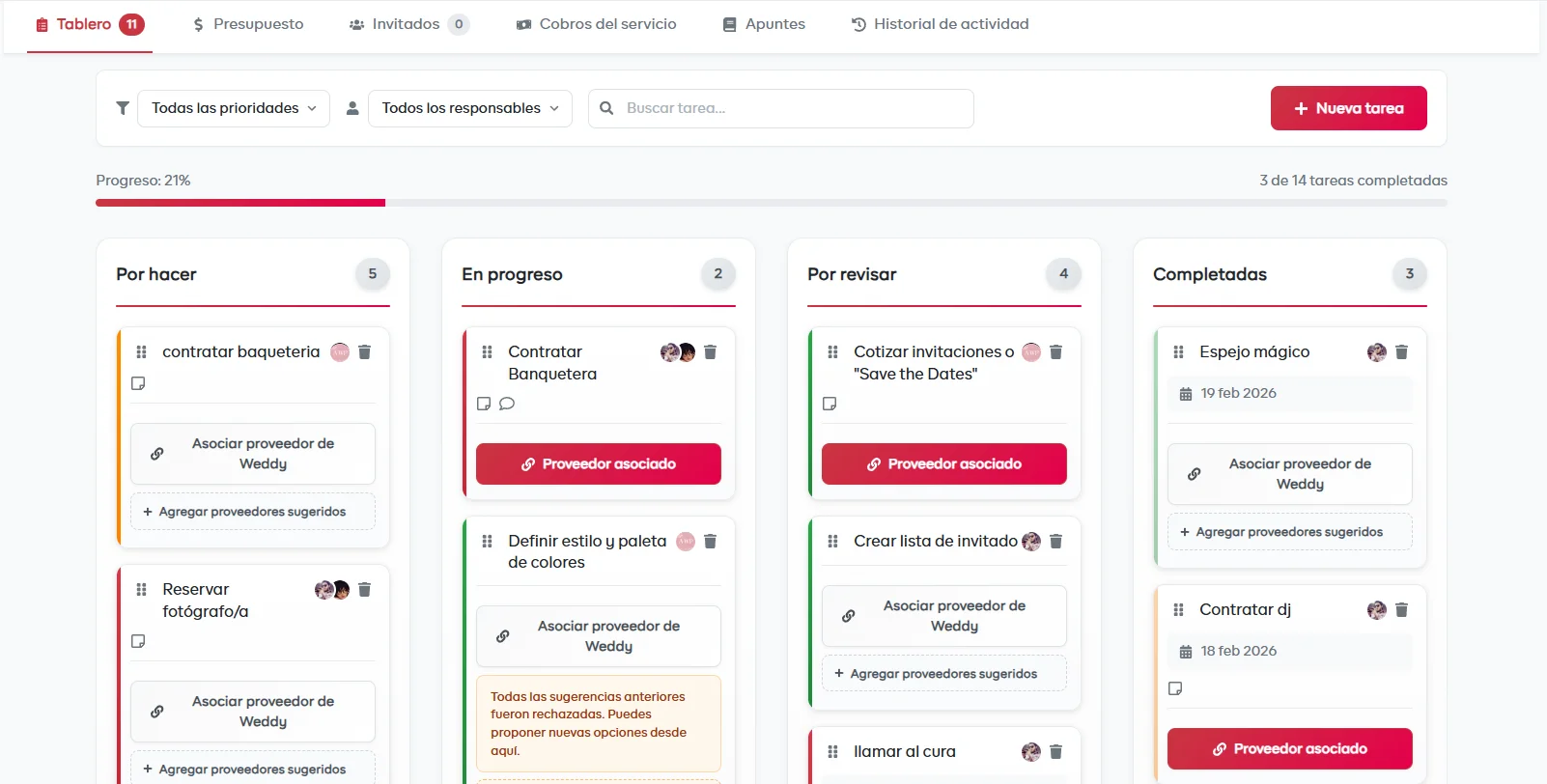 Centraliza tareas, novios y proveedores en una sola plataforma.